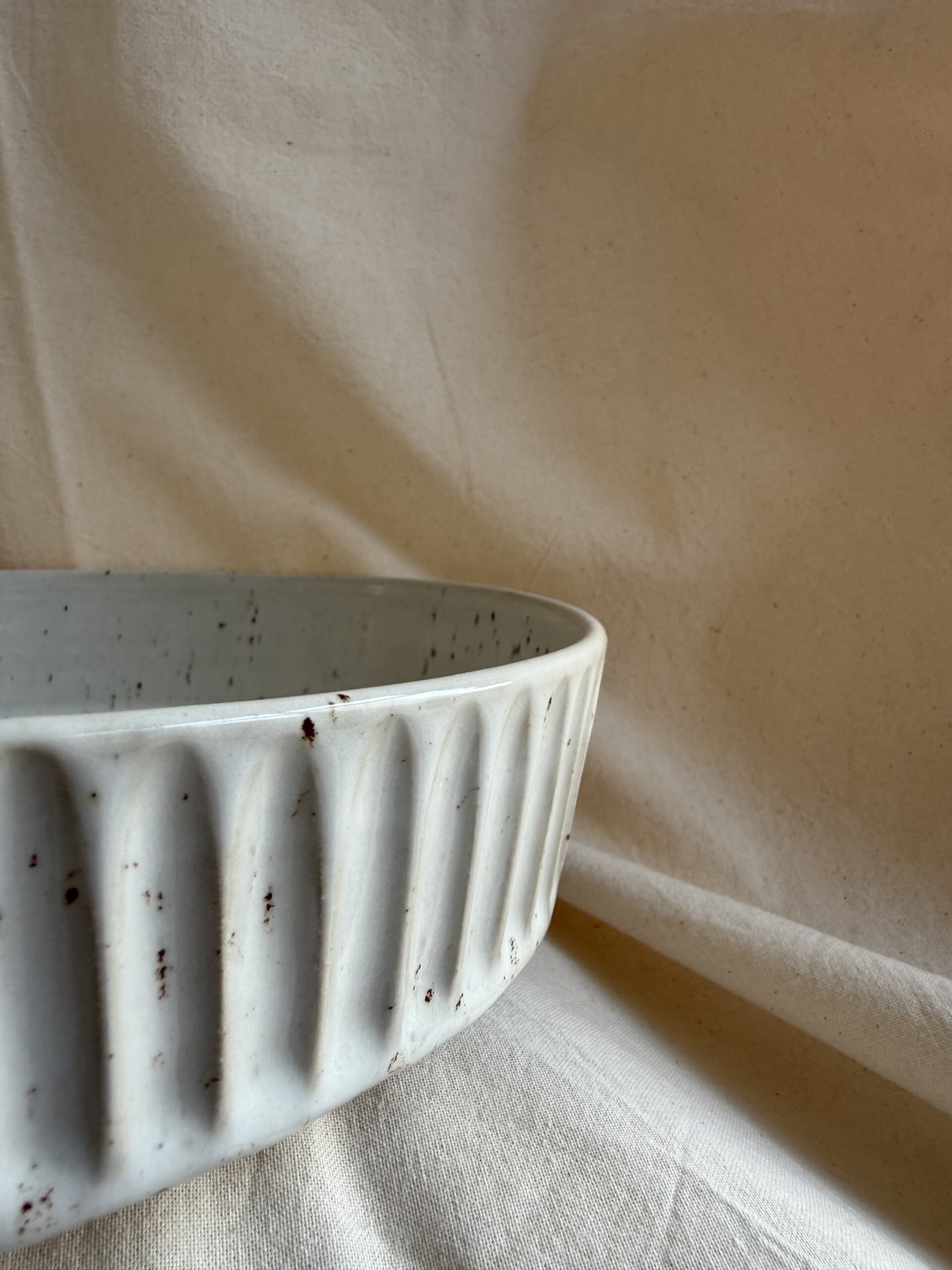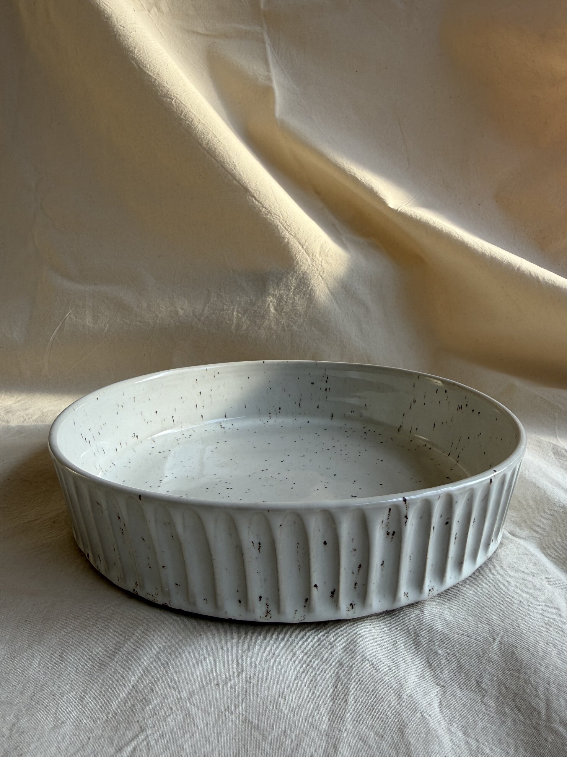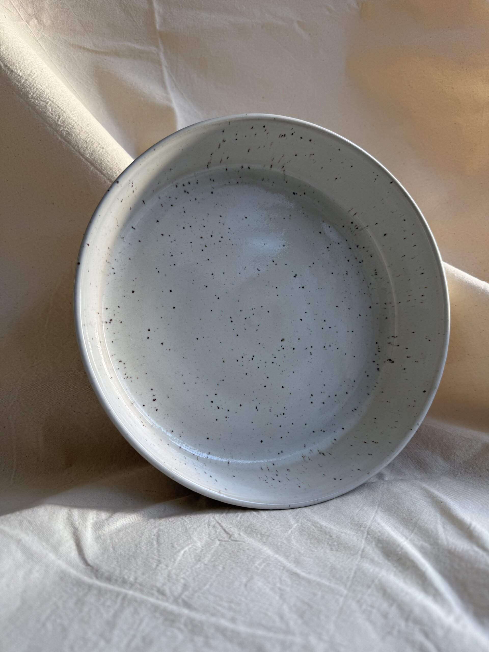 Wheel thrown flat bowl, hand carved. bowl is made of white stoneware white speckled non toxic and food safe glaze used.