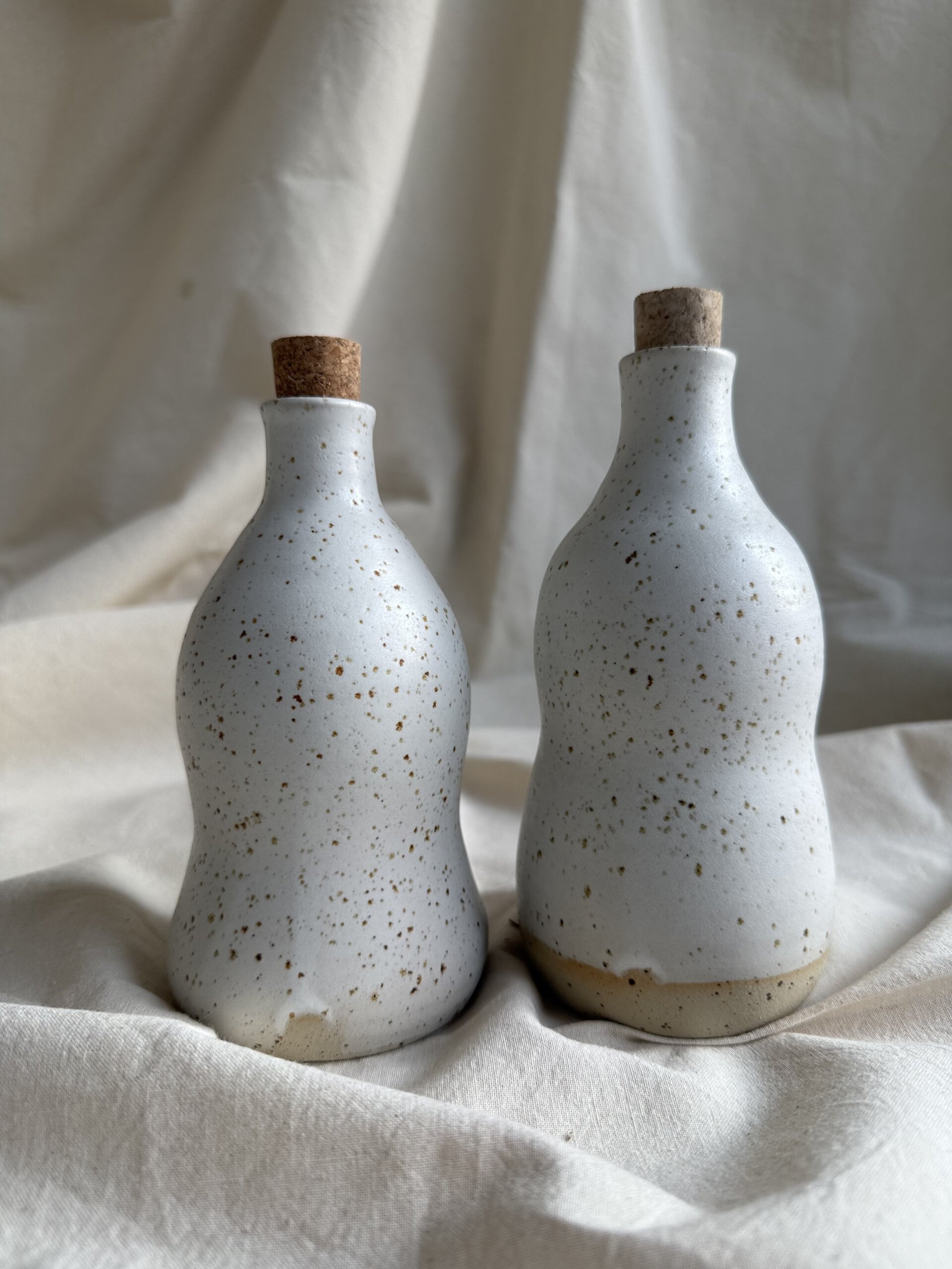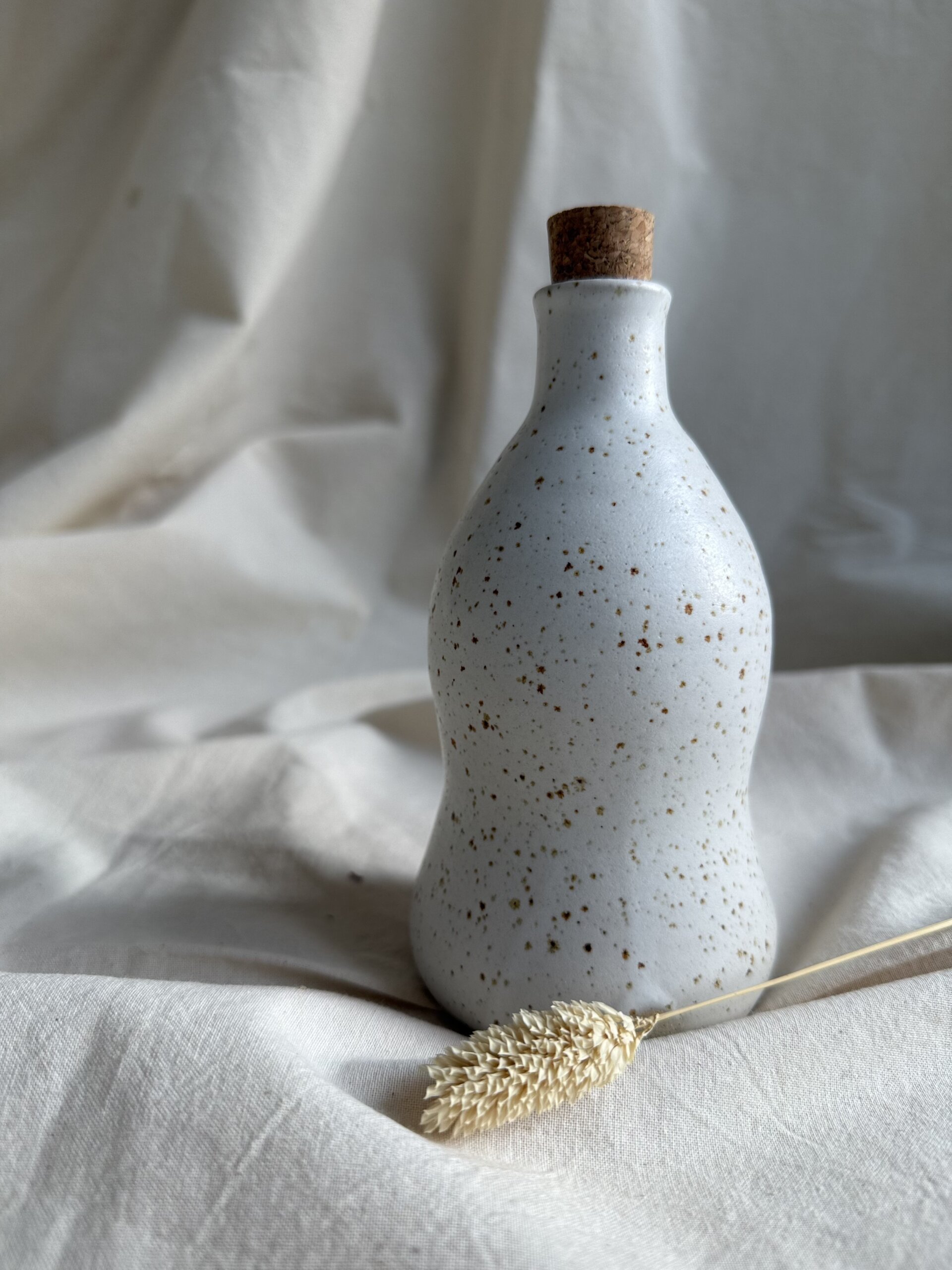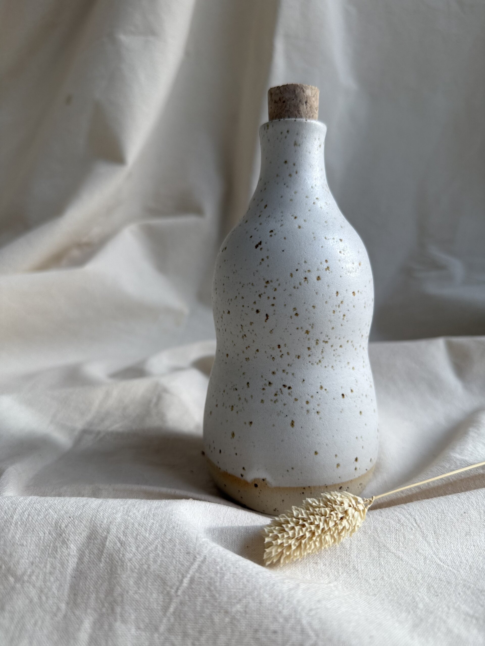 Wheel thrown bottle made of speckled stoneware. The shape of thr bottle is adapted to be nicely handheld while the oil is poured. Each piece is one of a kind and slight variation in colour and size may occur. White matte food safe and non toxic glaze used.